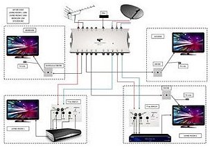 With this type of system a single satellite receiver, positioned at a dedicated position, can distribute one selected satellite channel to all points. Obviously only one satellite channel at a time can be viewed.